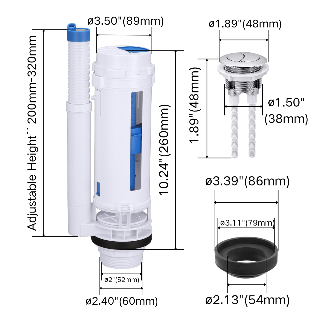 This toilet tank repair kit is a complete solution designed for replacing internal parts in standard two-piece toilet tanks. The set includes an adjustable toilet fill valve, a 2-inch dual flush valve, a chrome top push button, gasket, and connecting bolts, providing everything needed for efficient installation and long-term performance.